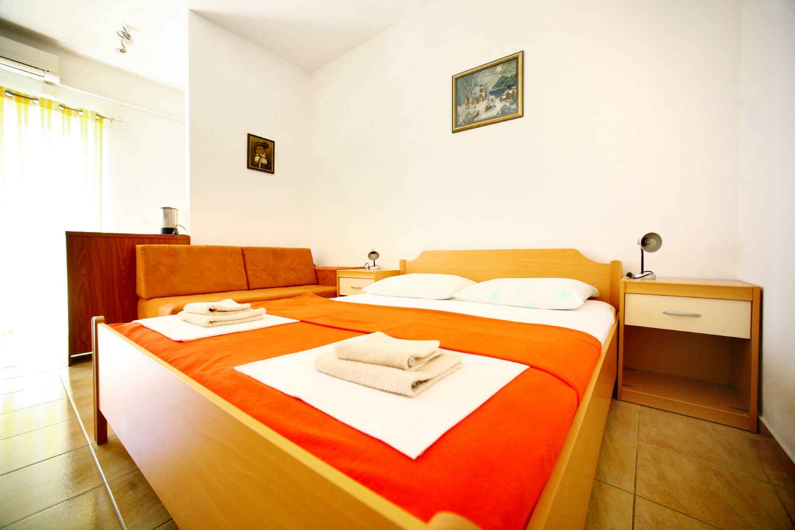 This apartment is suitable for 2 adults sharing a double bed and one person on the sofa bed if required. Both beds are in the same room.