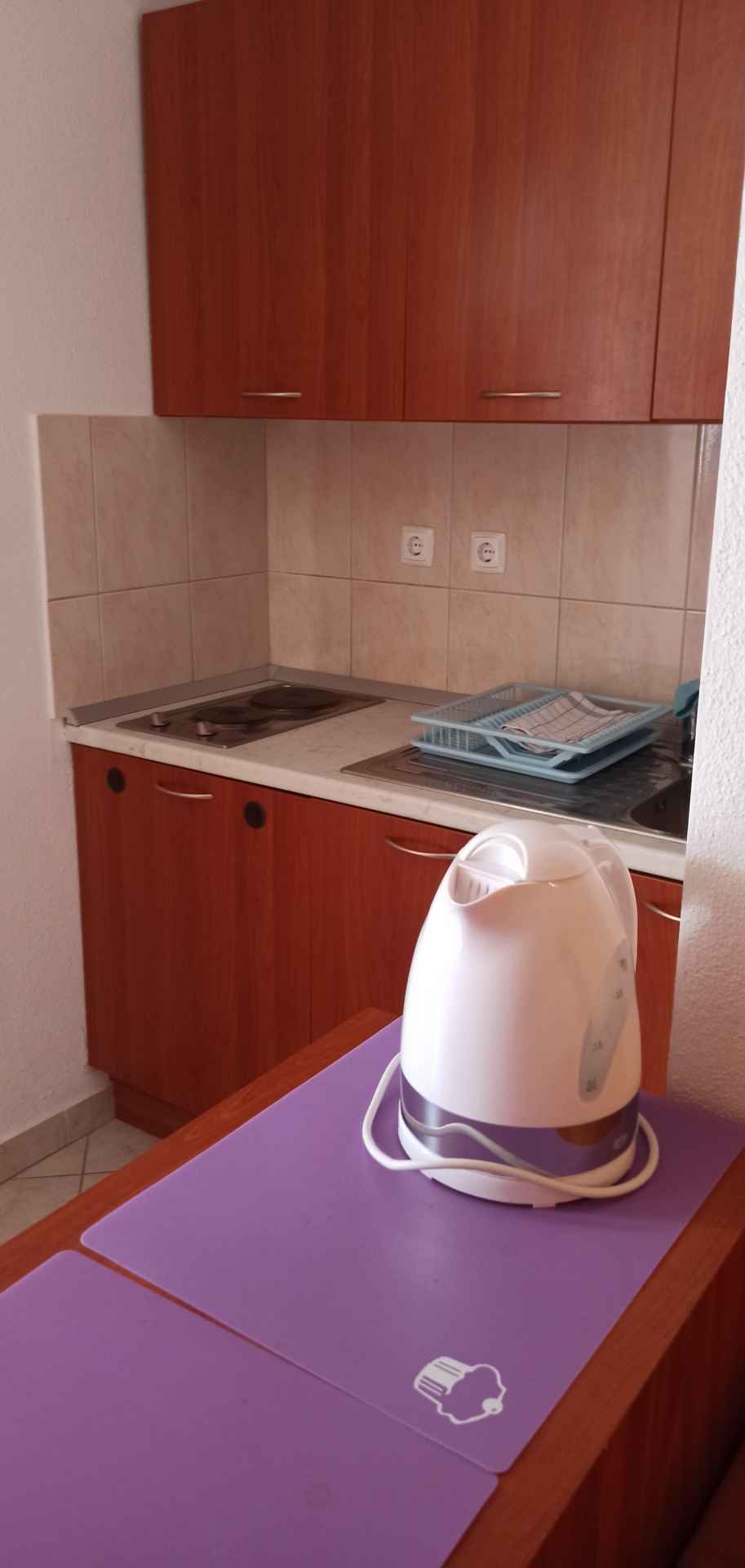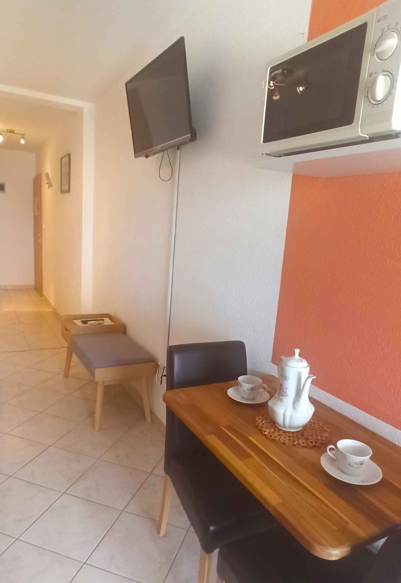 Fully equipped kitchen (stove, microwave, coffee machine, kettle, toaster, fridge with freezer compartment as well as cooking utensils and cutlery)